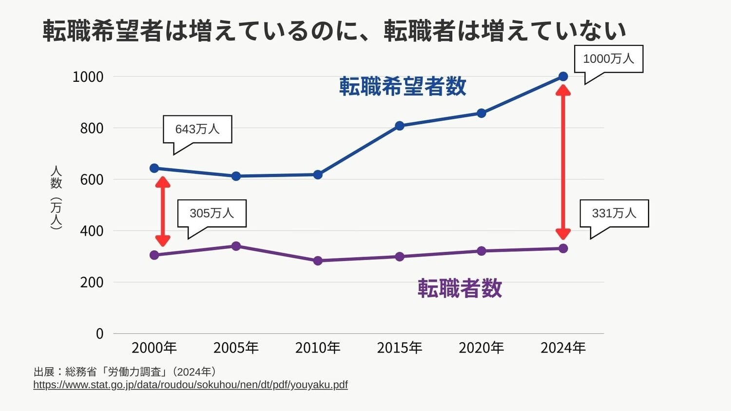 - 総務省「労働力調査」によると、2024年の転職希望者数は1000万人。