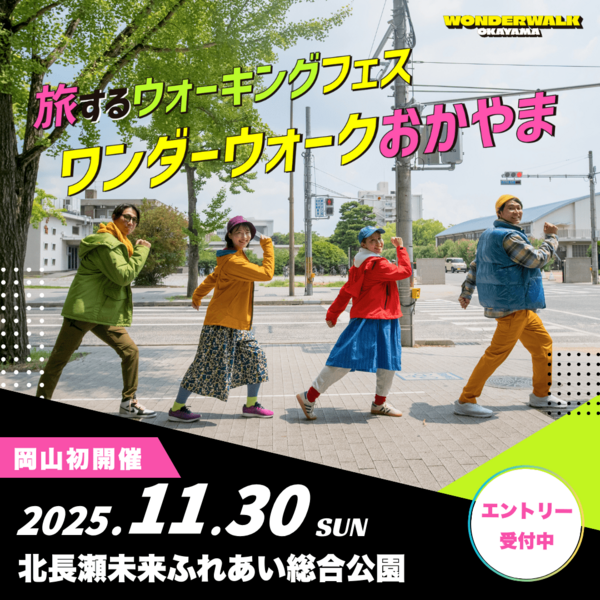 2025年11月30日(日)に開催される「ワンダーウォークおかやま2025」の大会を一緒に盛り上げてくれるボランティアスタッフを募集します。会場ではマルシェやライブなども開催予定です!