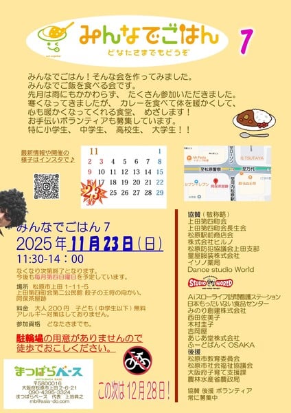 任意団体まつばらベースが地域食堂「みんなでごはん」を毎月第4日曜日に開催しています。