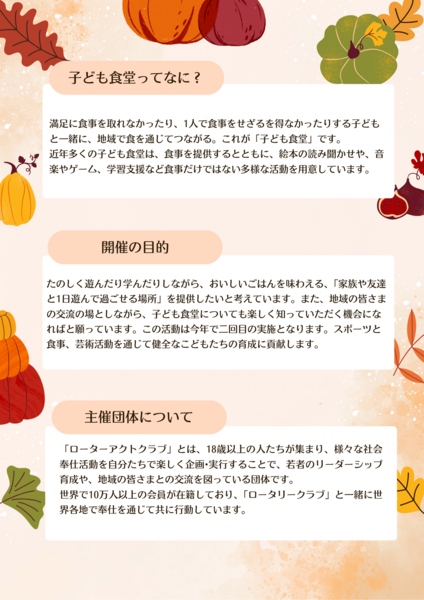 楽しく遊んだり学んだりしながら、おいしいごはんを味わえる「家族や友達と1日遊んで過ごせる場所」を提供します。地域の皆さまの交流の場として、こども食堂について楽しく知っていただく機会にもなればと願っています。