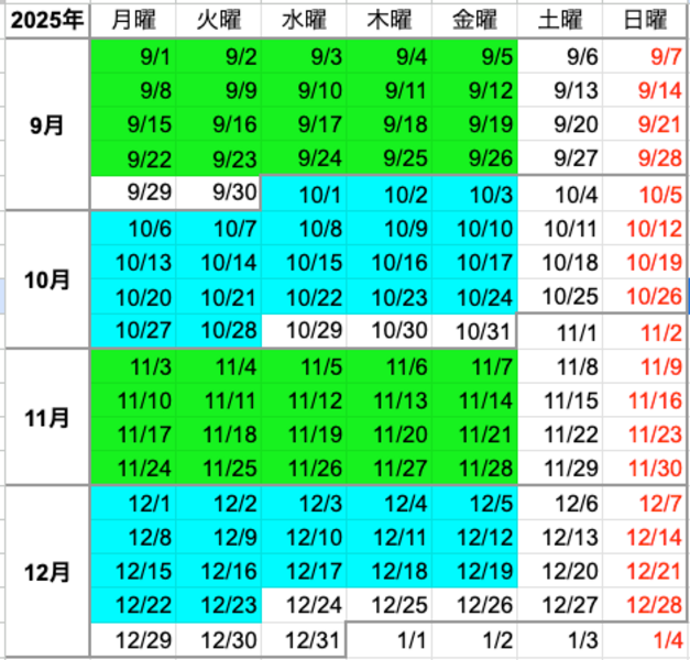 2025年開催日:色がついている日が開催日です。月のレッスンが3回の場合は、授業料の75%のみお支払い頂きます。