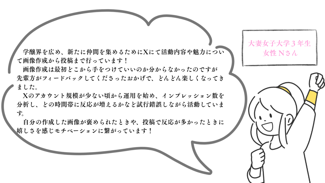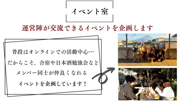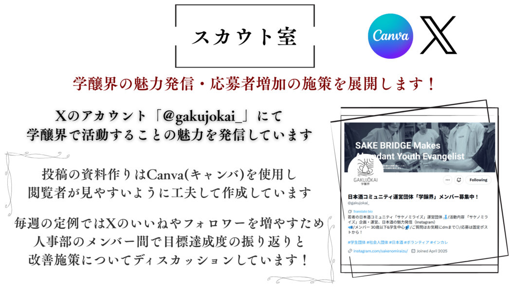 たとえば「学醸界の魅力をどう伝えるか」「メンバー同士がより仲良くなれるイベントとは何か」といったテーマを自ら考え、投稿のデザインや文章を作成したり、イベントの運営まで関わることができます。