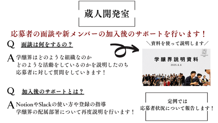 SNS運用や、応募者の面談・研修、運営陣内のイベント企画・運営などを経験できる!