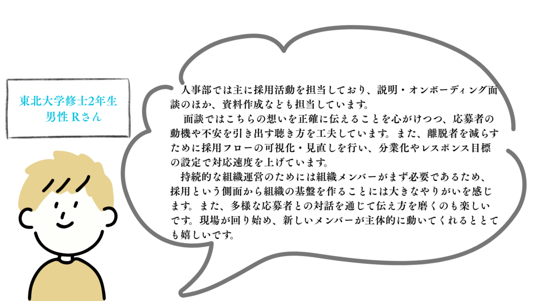 ◎応募者の方の質問に対して疑問が残らないように説明したり、学醸界で活動する魅力についてわかりやすいように工夫して伝えたりするため、聞く力や相手方に伝える力の両方を磨くことができます。