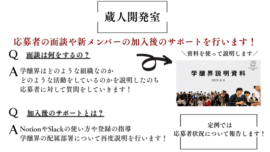 学醸界の活動は、大きく「プロモーション部」「企画開発部」「人事部」の三つの部署に分かれて運営されています!