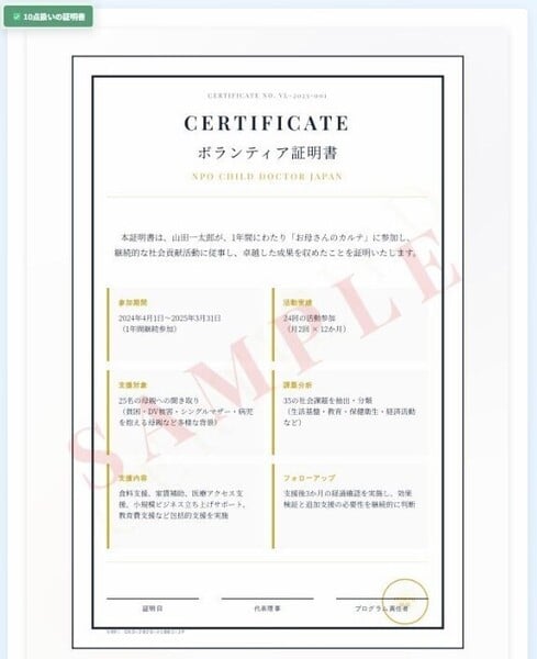 このプログラムは、2002年から20年以上、ケニアで活動を続けているNPOチャイルドドクター・ジャパンとオンラインボランティア事業のコラボ事業になります。ボランティア証明書は、NPOチャイルドドクター・ジャパン名で発行しております。NPOチャイルドドクター・ジャパンは、ケニアのナイロビ市内にあるスラムを中心に、現在、1500人以上のチャイルドに医療支援をしています。