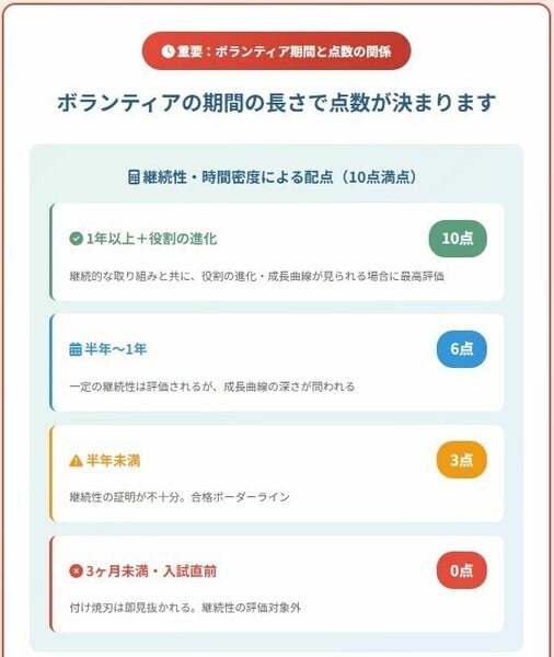 | B. 継続性 時間密度 | ③ 期間 × 濃度係数 (10点) | 0点:3ヶ月未満・入試直前 3点:半年未満 6点:半年〜1年 10点:1年以上+役割の進化 | 10点 |
