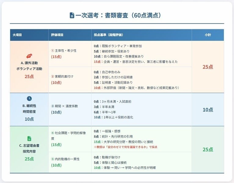 | A. 課外活動 ボランティア活動 | ② 客観的裏付け・証明書 (10点) | 0点:自己申告のみ 2点:参加しただけの証明書 5点:証明書・活動記録あり 10点:外部評価(新聞・論文・表彰、数値など成果記載あり) | 10点 |