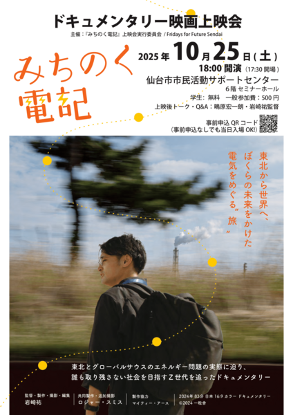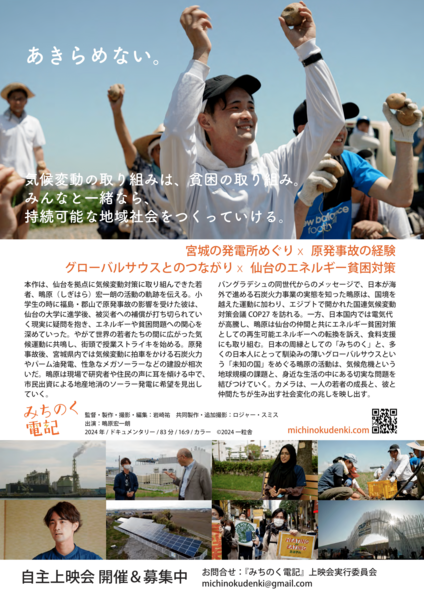 誰も取り残さない社会を目指す仙台の学生環境活動家・鴫原宏一朗を追ったドキュメンタリー。上映後は監督およびFFFメンバーとの交流の時間もあります!