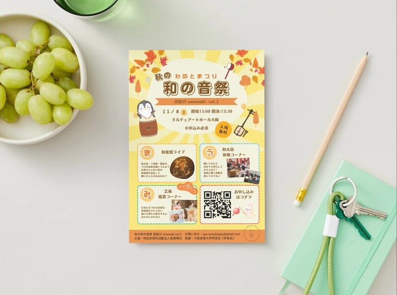 「秋の和の音祭 音結び-omusubi-」で、受付・席案内・体験の見守りなどを行うイベントスタッフのボランティアを募集します。子どもたちと日本の伝統文化を楽しみながら支えてください。