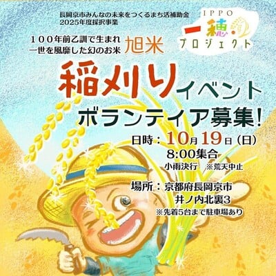 長岡京市で開催される、旭米の稲刈りイベントのボランティアさんを募集します。