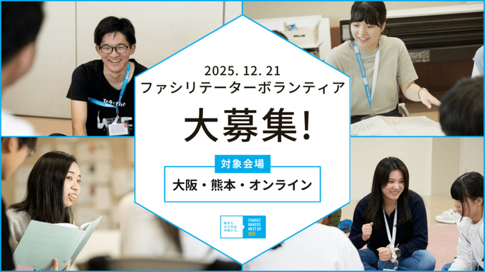 2025年12月21日(日)大阪、熊本、オンラインで同時開催される、社会問題に対してアクションを起こした25歳以下が集う交流イベントです。第1部は、全会場をオンラインでつなぎ、活動家や著名人のスピーチや、アクションのインパクト発表などを聞く時間。第2部は、会場ごとに参加者が交流をする時間を予定しています。チェンジメーカー・ミートアップ2025では、現在、イベント当日のファシリテーターを担当するボランティアスタッフを募集中です。