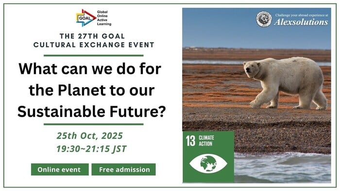 オンライン国際交流会で、「SDGs13:気候変動に具体的な対策を」について、国境を越えて英語でディスカッションしてみませんか?日本人研修生による英語のプレゼンもご覧になれます。