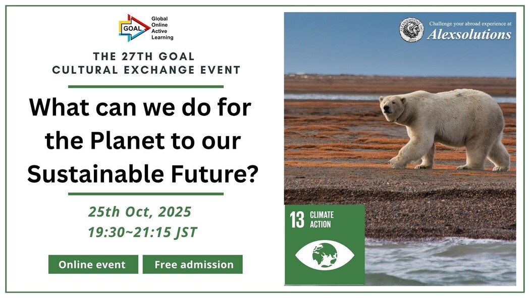 この国際交流イベントは、アレックスソリューションズが主催するグローバル人材育成プログラム「GOAL」の第27回発表会として行われます。
