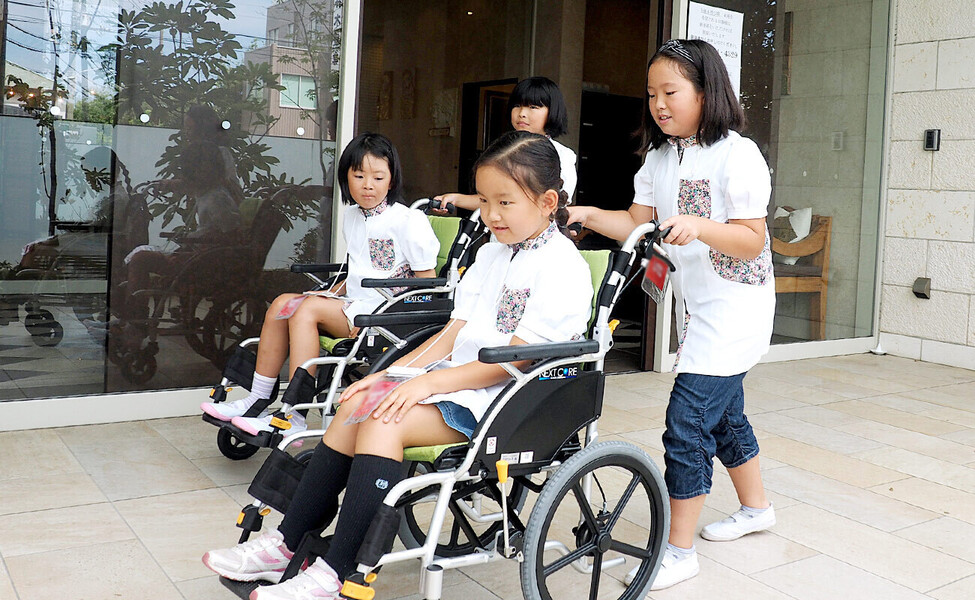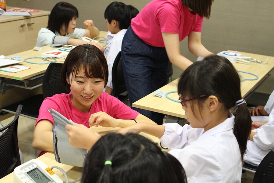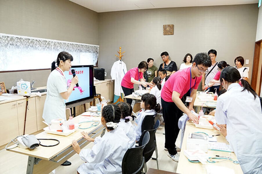 本物の介護施設に小学1~4年生の子供が50名来場し、介護士、看護師、管理栄養士、リハビリ職の職業を体験するキッザケア