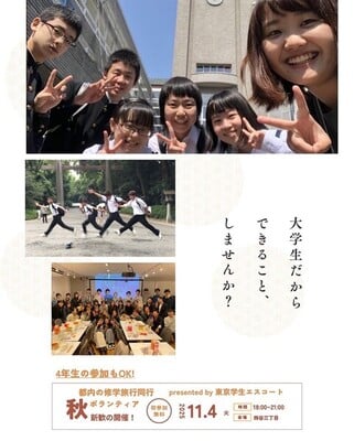 地方から東京に修学旅行に来る中高生の班別活動で、当日のエスコート活動に参加できる大学生を募集します。