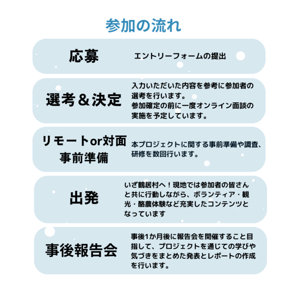 入力いただきました内容をもとに、選考を行わせていただきます。選考結果についてはこちらからフォームに入力していただきましたメールアドレス宛に、ご連絡差し上げます。選考に進まれました方には、ご参加を決定する前に一度、オンライン上でプロジェクト説明と面談を実施させていただきます。プロジェクト内容についてご理解いただいた上で、参加者様の意向を最終確認いさせていただきます。