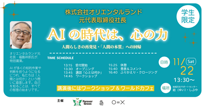 オリエンタルランド元社長・福島祥郎氏を講師に迎え、AIでは再現できない「人間らしさ」や「心の力」をテーマに考えます。