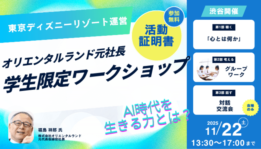 活動証明書あり!AO・就活にも活かせる特別イベント。ディズニーリゾートを運営してきたオリエンタルランド元社長と一緒に、“AI時代の人間らしさ”を探る体験型ワークショップ。