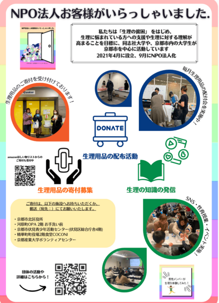 生理の貧困や、生理に悩まれている方へ支援を行う団体です。生理の貧困に対して、市民の方々からの寄付募集と、生理用品の配布活動を行い、生理への無理解・無関心に対して性教育や知識発信を実施しています。