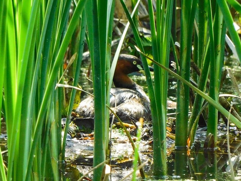 大池やその北側のアヒル池では植生の回復が進んでいて、池のいたる所でガマやマコモなどの抽水植物が生育しています。これらはカイツブリの営巣や小さな水生生物の隠れ家として、とても重要です。