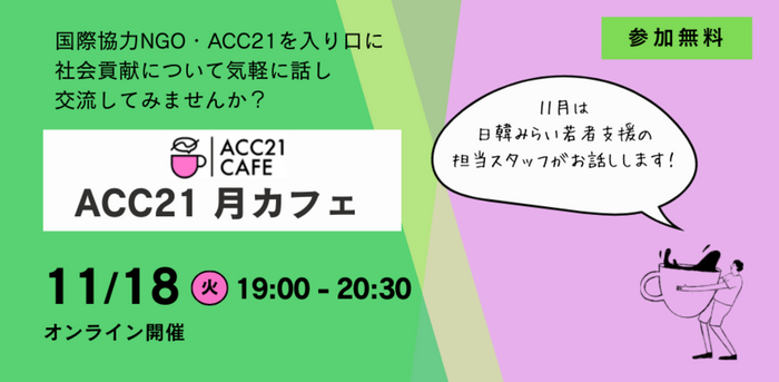 11月18日夜、オンラインで国際協力や社会貢献について気軽にお話しする『ACC21 月カフェ』を開催します。ぜひお気軽にご参加ください♪