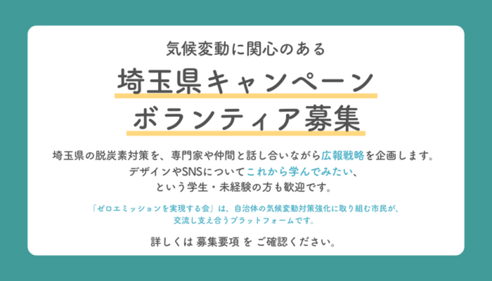 自治体の脱炭素を進める市民のプラットフォーム「ゼロエミッションを実現する会」では、埼玉県でのキャンペーン展開を行う際にコアで活動するボランティアさんを募集します!