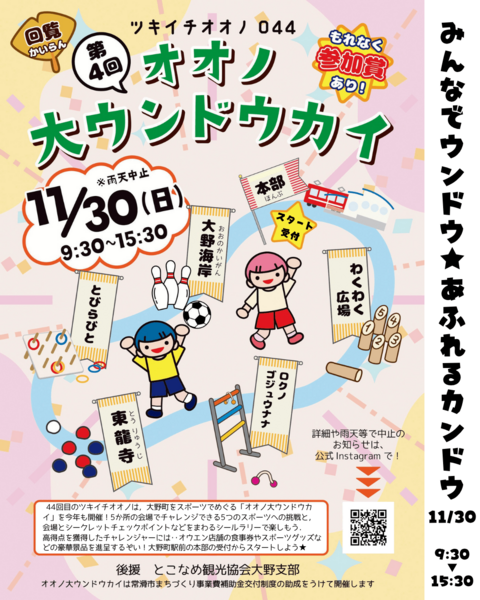 常滑市大野町で開催されているまちづくりイベント「ツキイチオオノ」.その44回目の企画は「オオノ大ウンドウカイ」です.だれでもチャレンジできるスポーツ体験を,まち全体をフィールドにして楽しもう!という企画です.4回目のウンドウカイとなる今年は‥まちの5か所にスポーツ会場を設けて,会場をめぐりながらスポーツにチャレンジ,勝負結果におうじてシールを集めて,総得点に応じて景品もゲットできるという内容です.