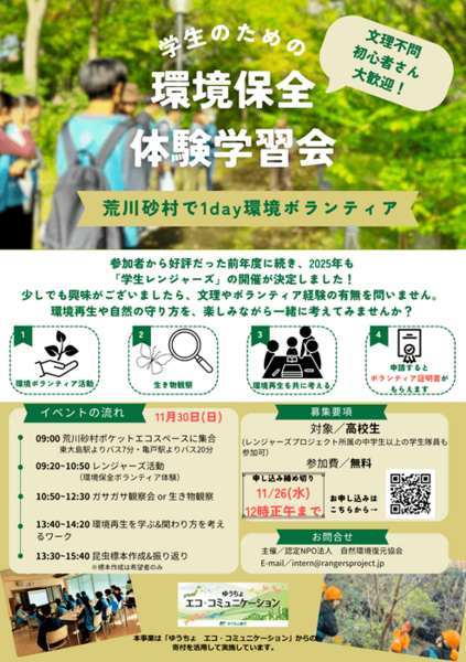 今回は、上記のような関心や悩みを持っている学生を対象に、身近な自然への関心をより一層高め、保全活動へ参加するきっかけづくりとなるプログラムを企画しました!東京都の荒川砂村を舞台にした環境保全のボランティア活動(レンジャーズ活動)を体験できるのはもちろん、現地のビオトープ生態系を知れる「ガサガサ、生き物観察会」、「標本づくり」や、同世代の学生と意見を交わしながら環境問題について考える「環境再生を学ぶ&関わり方について考えるワーク」も体験できるイベントとなっています!