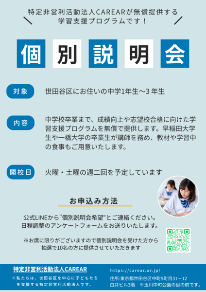 世田谷区中町(最寄駅:用賀駅)で運営するSTUDIO CAREAR(中学生向けの無償学習教室)にて、成績向上・受験に向けた勉強指導をしてくださるボランティアを募集しています!