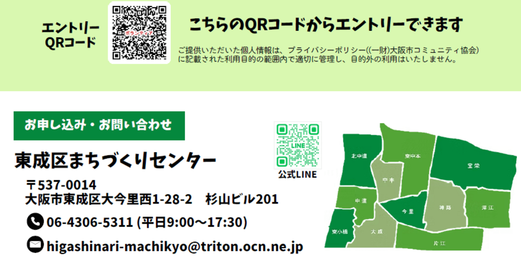 まずは東成区まちづくりセンターにご連絡、またはQRコードからご応募いただき、エントリーをお願いいたします。