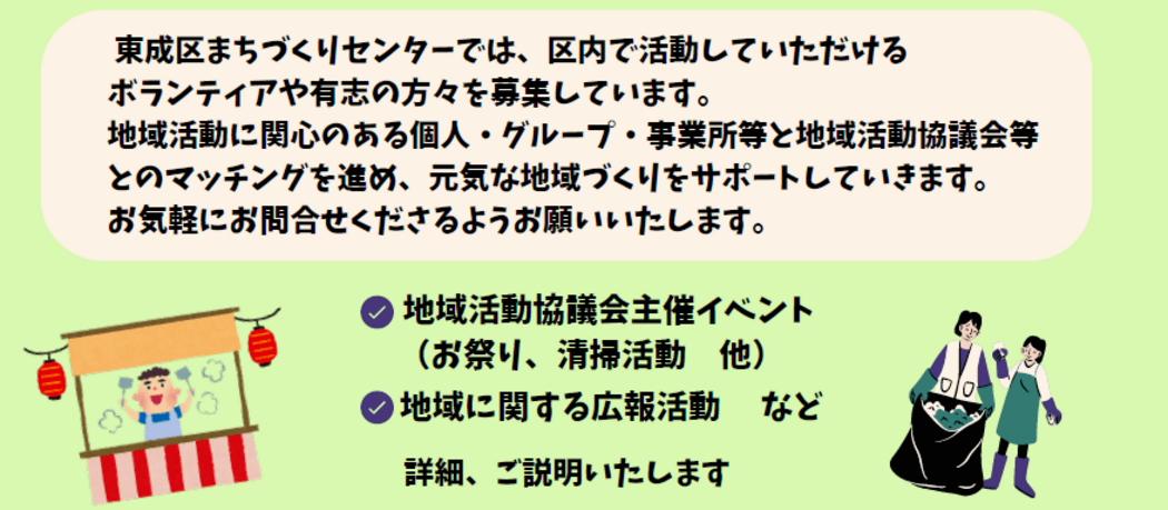 東成区まちづくりセンターでは、地域活動に参加して下さるボランティアさんを募集しています!!
