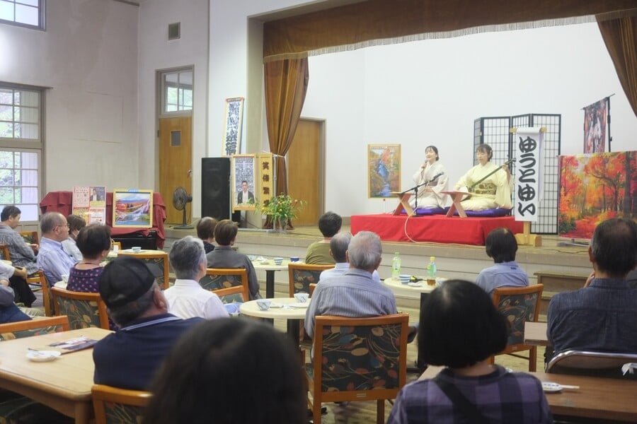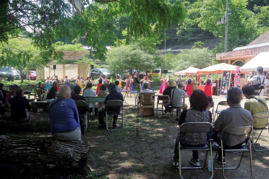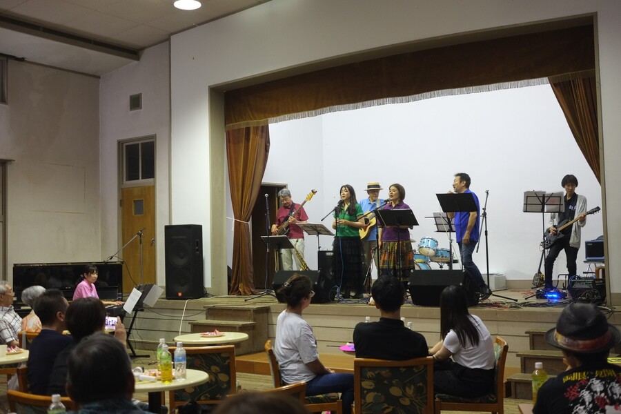 旧上西中学校の木造講堂は音響がいいと評価されています。屋外仮設ステージもできます。