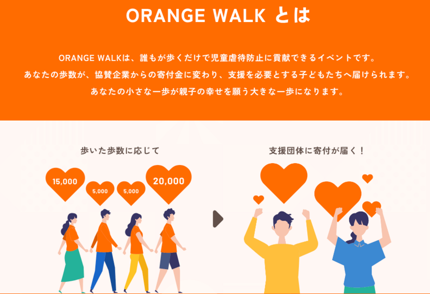 「ORANGE WALK」は、全国どこからでもスマートフォン1つで参加できる児童虐待防止の願いを込めて歩くチャリティー企画。あなたの歩みを、こどもたちの笑顔を守る大切な支援へとつなげてみませんか?
