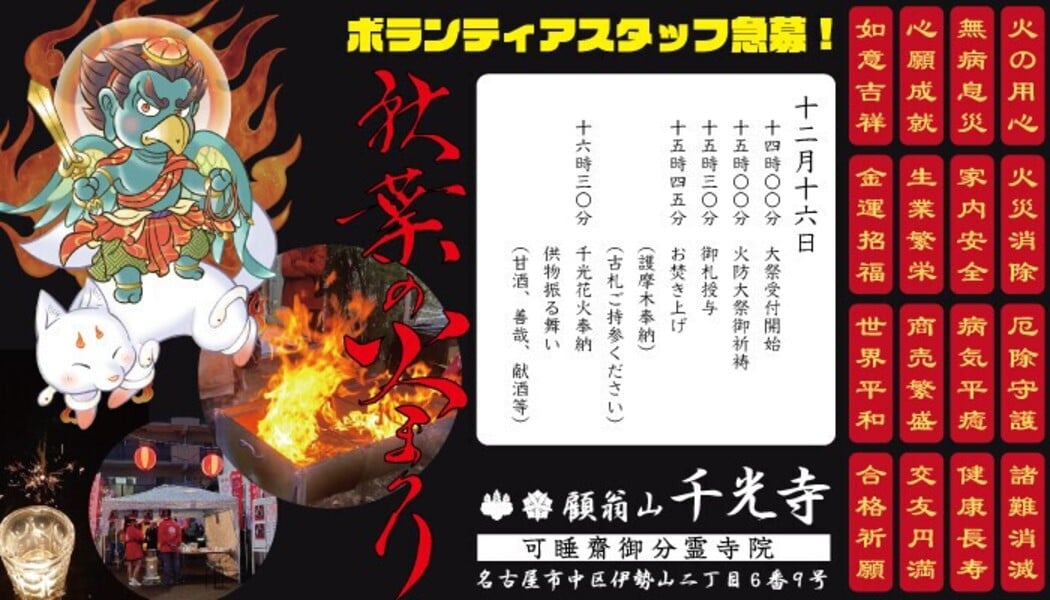 火の用心、無病息災にご利益!秋葉三尺坊大権現『火防大祭』令和7年12月16日15時から御祈祷を開催するお寺「千光寺」にて行事の準備、補助、片付けをお願いいたします。