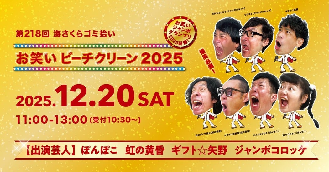 「1年間皆様と活動させていただきありがとう」の気持ちをこめて、芸人さんと一緒にビーチクリーンをして、ピカピカのきれいになったビーチで、芸人さんのネタを見てみんなで笑って1年を締めよう!という、年末のイベントです。 今年で11回目となる人気のビーチクリーンです。【出演芸人】