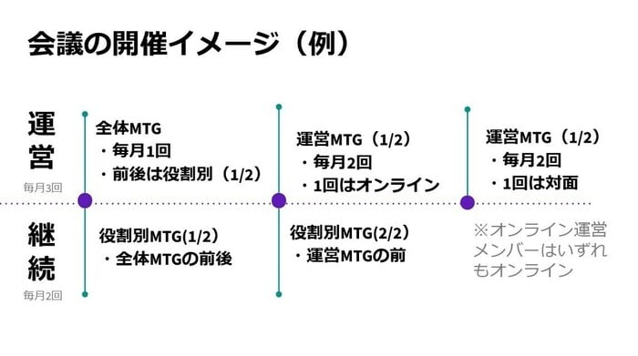 ・ただお仕事や学業が忙しい場合や、都合がつかない場合などは、MTGには参加しなくても、議事録やその読み合わせなどに参加いただければOKです。・ただ、2か月にわたり、いずれのMTGにも参加できない場合は、活動継続が難しいと判断することもございます。