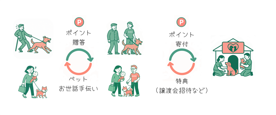 地域の高齢者や困っている方のペットをお散歩やお世話をし、その対価が1円1pt制で動物保護施設への寄付に変わり