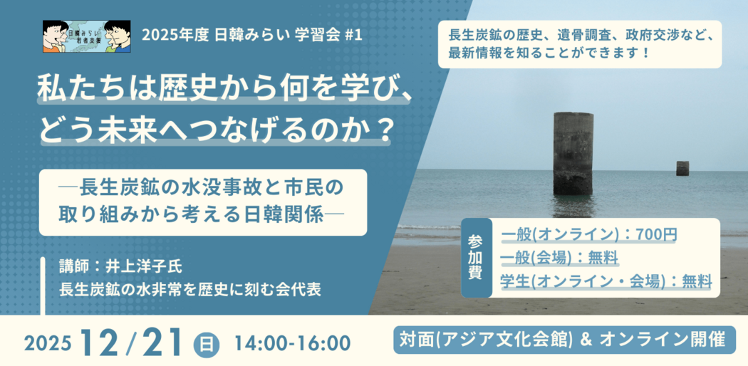 日韓みらい若者支援事業では、 2025年12月21日(日)に学習会#1「私たちは歴史から何を学び、どう未来へつなげるのか? ─ 長生炭鉱の水没事故と市民の取り組みから考える日韓関係 ─」を開催します!