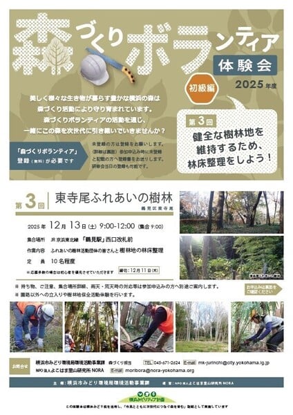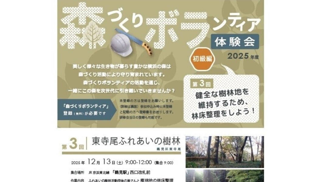 | 現地団体 | 東寺尾ふれあいの樹林愛護会(現地団体) よこはま里山研究所NORA(事業受託) 横浜市みどり環境局環境活動事業課(主催) |