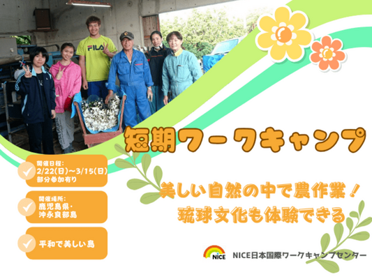 <公用語が日本語で、日本人・日本在住者が中心の、小遣い付プログラム>農家グループ(葉棚さん・三島さん・田中さん)と共催。NICEの代表が学生時代、ファームステイした縁で1995年に開始。目的は、①離島の花卉や芋等の栽培は人手不足でバイトもなかなか集まりにくいため、ボランティア・パワーでお手伝いをする。また、農家さんのご厚意で農作業の日には活動報酬として1日5000円を支給していただける。