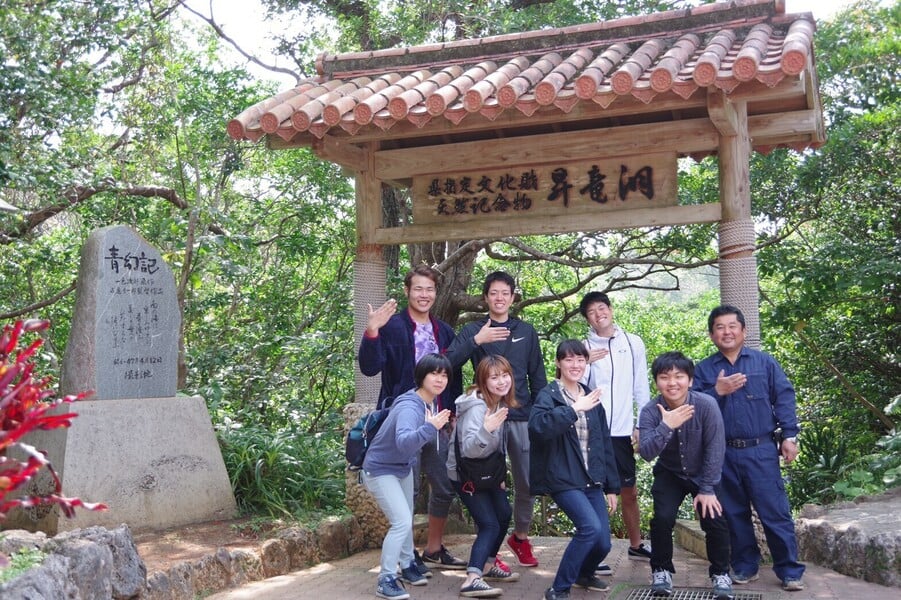 島内遠足(鍾乳洞、日本一のガジュマルの木等)。休日の1日は、農家の方に連れて行って頂ける!ウミガメを見たり、3月でも泳ぐ人も。歓迎会・さよなら会も通常開催。