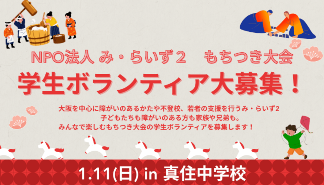 - 【学生ボランティア】新年もちつきイベントで子どもたち・障がいのある方のサポート