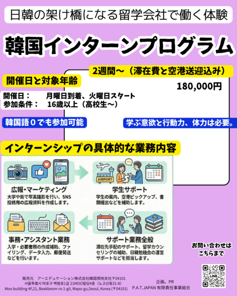 (19歳・大学生) 「ずっと韓国が好きで、旅行ではなく『生活』や『仕事』を体験してみたいと思い参加しました。最初は韓国語が全く話せなくて不安でしたが、日本人スタッフや翻訳機も駆使しながら、SNSの動画撮影や街中のリサーチに挑戦! 自分が投稿したリール動画を見て『韓国留学を決めました!』というコメントがついた時、自分の力で誰かの人生のきっかけを作れたことに、言葉にできない喜びを感じました。ただの『ファン』から、将来は日韓を繋ぐ仕事がしたいという明確な『目標』に変わった、一生モノの2週間でした!」