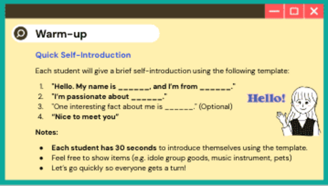 • マンツーマン実践: 学んだフレーズを1対1交流で実践することで会話力を鍛えます