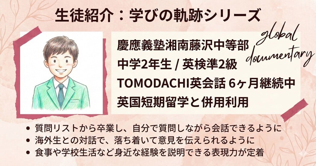 習った英語を「使う」から身につく!海外進学校の同世代と毎週1対1で話し、国境を越えた親友を作るオンライン留学。安心の学校提携・選抜制です。自宅から世界が広がるワクワクを、まずは気軽に体験しませんか?