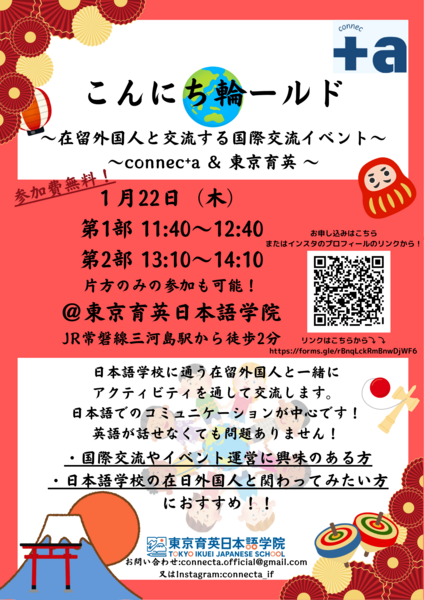東京育英日本語学院という日本語学校で開催される、国際交流イベントの日本人運営メンバーを募集しています。日本文化を取り入れた交流企画のサポートや、進行補助を行います。国際交流に興味のある方、大歓迎です!