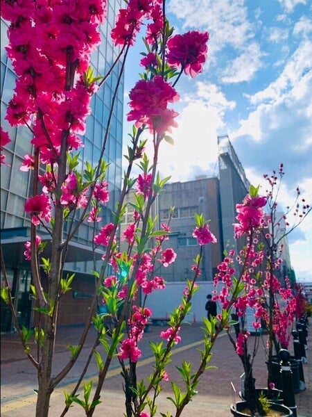 花見山の桜がディスプレイされる会場で春を感じながら、