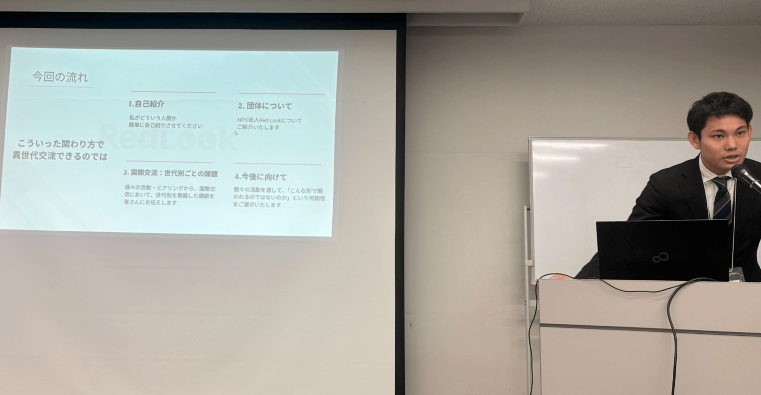 若い世代が国際キャリアを築きにくい、それを支えている国際ボランティアの高齢化。そういったことをRed Lookの取り組みの一環として解決できるのではないかと提示いたしました。