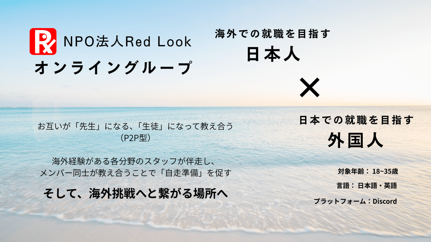海外で働きたい日本人と、日本で働きたい外国人が出会い、教え合いながら自走力を育てるP2P型オンラインコミュニティ。NPO法人Red Lookが運営し、海外挑戦を一部の人の特権にしない仕組みをつくっていきます